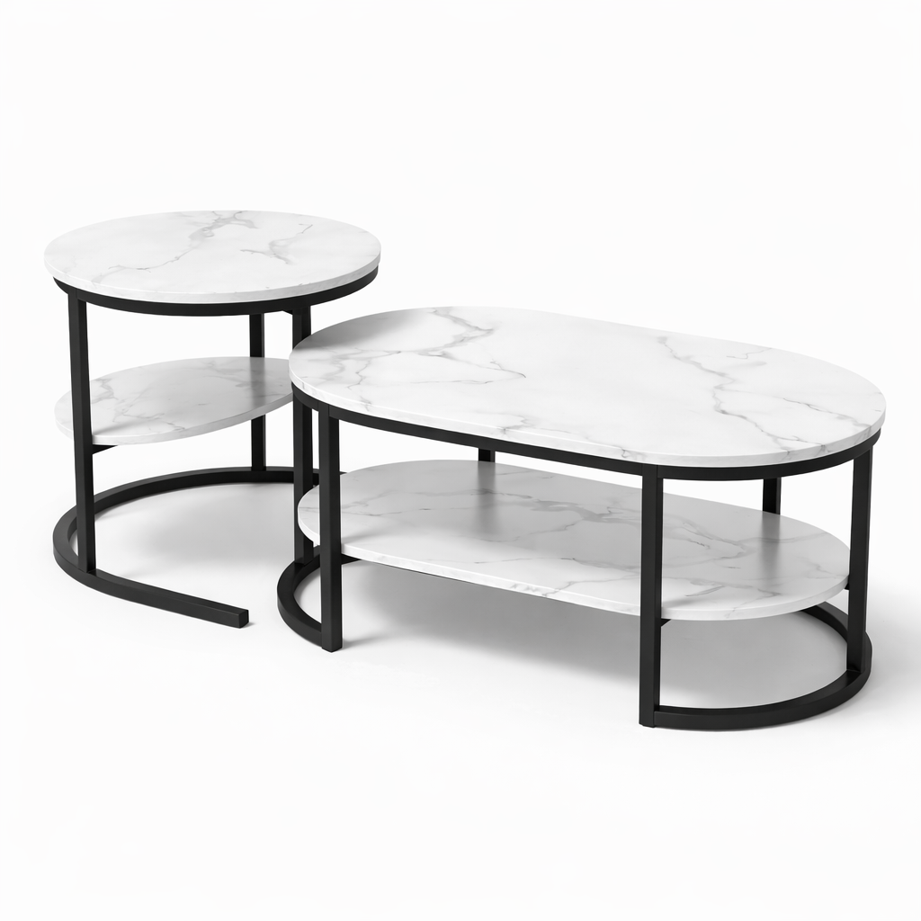 Le design a été pensé pour le quotidien : la forme ronde de la petite table permet de limiter les angles saillants, un atout appréciable pour les foyers avec enfants. Les plateaux en MDF haute densité reposent sur un châssis en métal renforcé, garantissant une stabilité optimale.