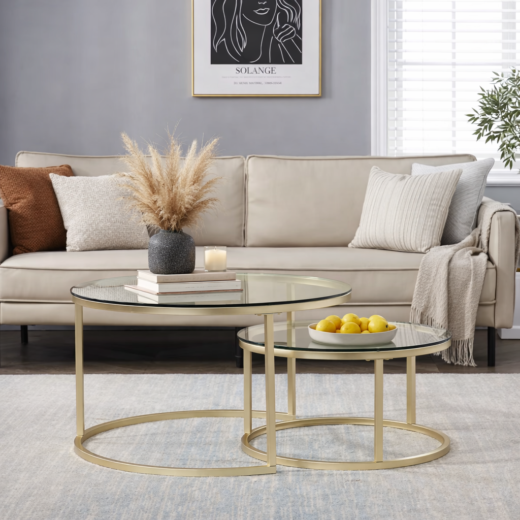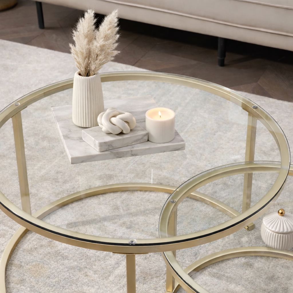 EvoluTable - Lot de 2 Tables Basses Gigognes Rondes Verre Trempé